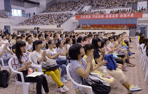 在介绍了学校的历史沿革和未来愿景之后,叶飞帆校长向在座新生抛出了一个令人深思的问题:读大学是要干什么?对此,叶校长表示,学校将致力于学术性、复合型、实践性的应用型人才培养。为了更好地培养应用型人才,学校今年最新修订完成了2014版人才培养方案,借助模块化的课程体系架构,在专业方向分流方面,给同学们提供更多的选择机会;同时设置了大量的辅修专业模块和选修模块,更加有利于同学们学习跨学科知识;同时,方案还加强了学时管理,努力帮助同学们提高学习效率,让大家把有限的时间和精力用在专业学习的刀口上,让每个同学在文理学院都有出彩的机会。叶飞帆校长满怀深情地说:“自从你们步入校门的那一天起,你们就和母校血脉相连了。希望你们继承和发扬母校修德求真的优秀品格,和母校共同成长,共享荣光。”