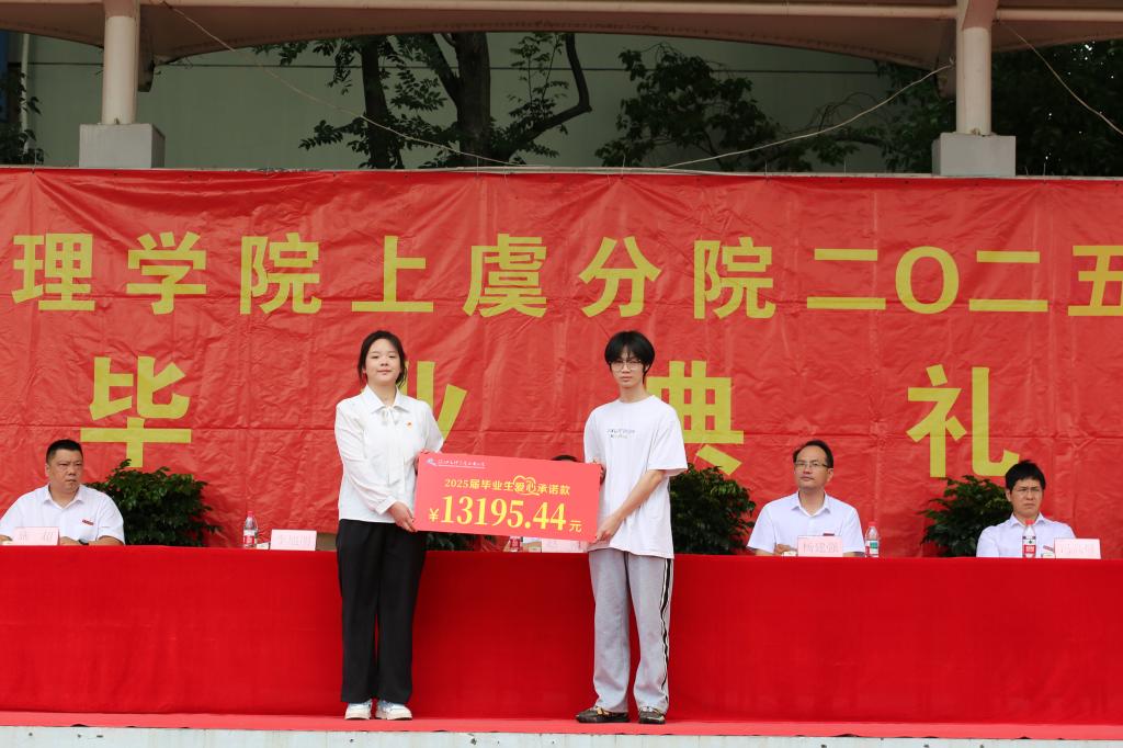毕业生代表陈颖莎向在校生代表大数据与会计专业石高翔交接“爱心承诺”款