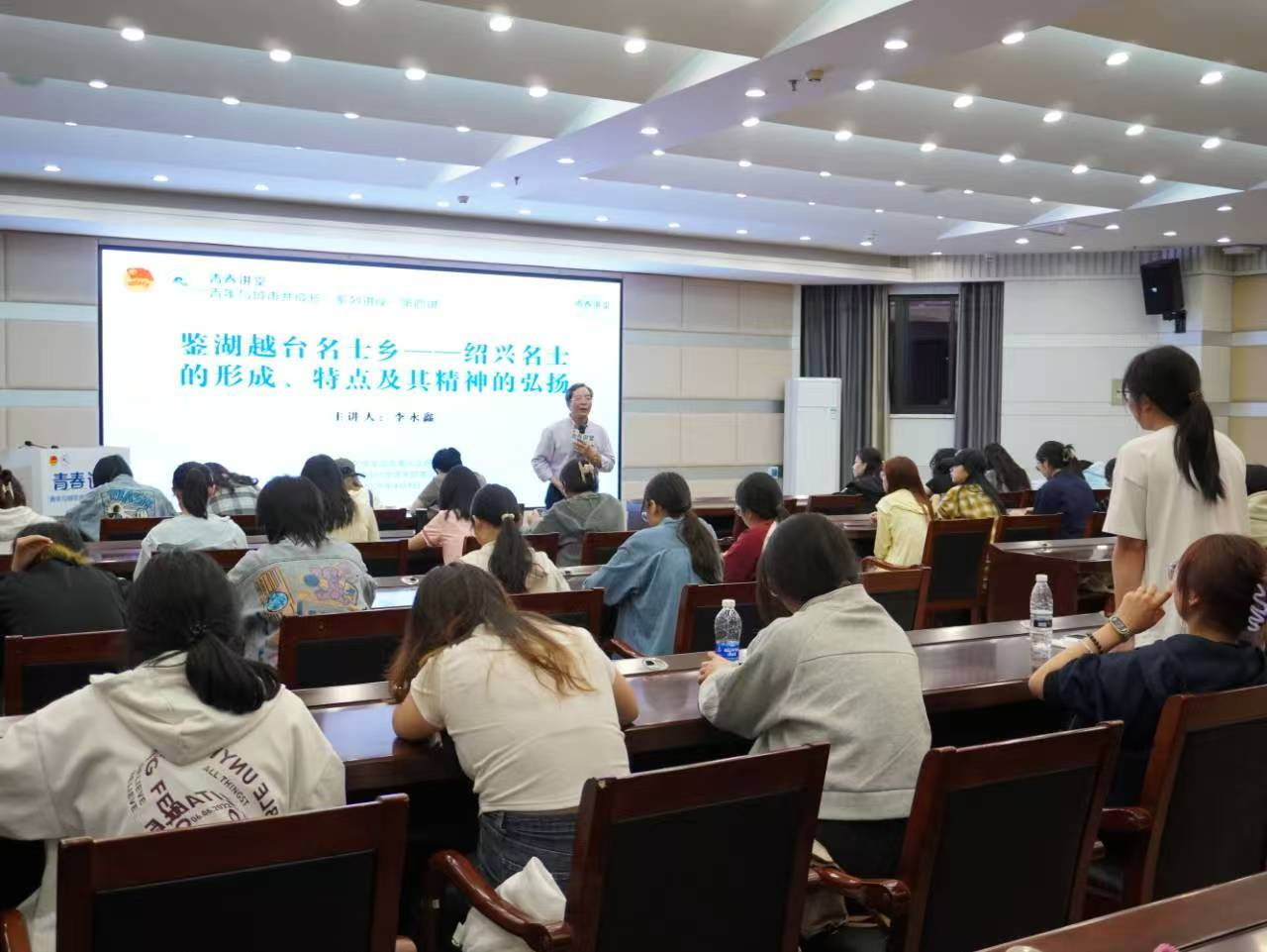 4月9日晚,绍兴市文史研究馆副馆长、绍兴市王阳明研究会专家委员会主任李永鑫以“鉴湖越台名士乡——绍兴名士的形成、特点及其精神的弘扬”为题,从绍兴的文化基因入手,向参加青春讲堂“青年与城市共成长”系列讲座第四讲的师生们娓娓道来绍兴的地域文化特色及其对绍兴经济、社会、人文的塑造作用。