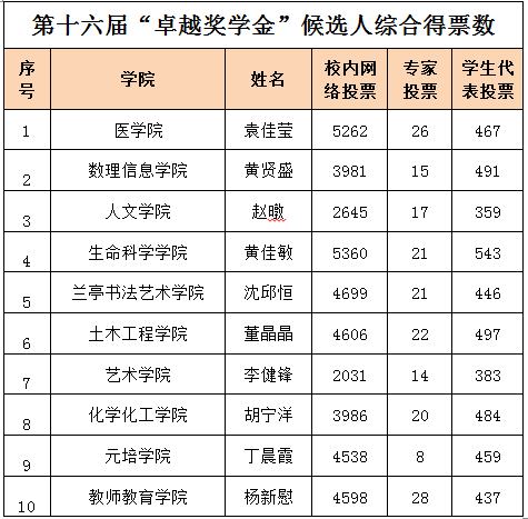 本次卓越奖学金评奖分为网络投票、专家评选及现场展示三个环节,十位候选人三个环节的综合得票如下: