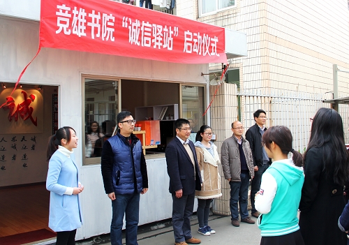 4月8日下午,竞雄书院“诚信驿站”启动仪式在河西校区5-9幢公寓门口举行。出席本次启动仪式有校纪委书记邱卫东,相关职能部门负责人,竞雄书院辅导员、学生团队成员等。