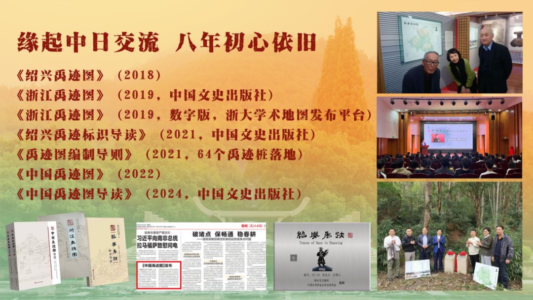 绍兴从2017年底开始编制“禹迹图”、2018年4月16日地方首张《绍兴禹迹图》发布、2019年《浙江禹迹图》出版、2021年《绍兴禹迹标识导读》出版并完成导则编制和64个禹迹桩的落地、2022年4月19日全国首张《中国禹迹图》发布、2024年《中国禹迹图导读》由中国文史出版社出版。历时八年,一群勇毅而果敢的人终于将大禹文化遗产创造性转化,并生动呈现出来,成为文化创新的成功样本。
