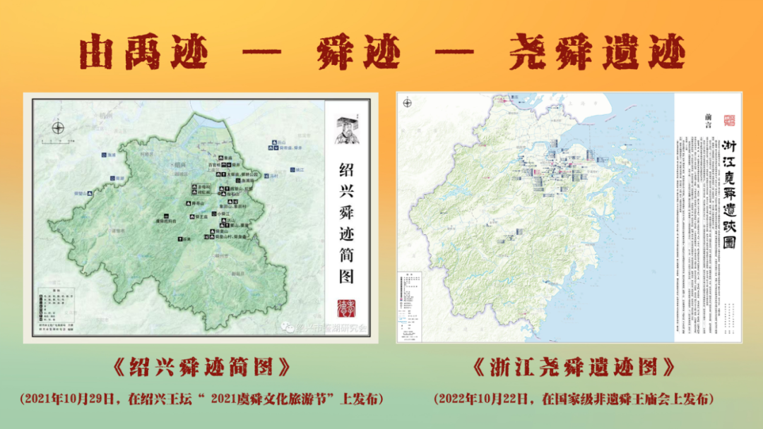 为了实现历史文化的更多链接,绍兴启动对“尧舜遗迹”的文化探寻。2021年10月29日,在绍兴王坛“虞舜文化旅游节”上发布《绍兴舜迹简图》、2022年10月22日在国家级非遗项目“舜王庙会”上发布《浙江尧舜遗迹图》。同时,作为东亚文化之都,绍兴在2021年推动文旅部建立东亚文化之都城市联盟工作机制的基础上,启动了“东亚禹迹”的文化探索工作,已完成“日本禹王遗迹”和“韩国禹迹”的部分翻译整理。目前,《浙江尧舜遗迹图导读》已交梓,即将由中国文史出版社出版。