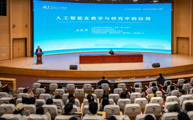 4月16日下午,风则江大讲堂第373讲在风则江大讲堂报告厅开讲,上海外国语大学原副校长、教授、博士生导师、国务院政府特殊津贴获得者、全国英语教学指导委员会副主任委员冯庆华应邀作题为《人工智能在教学与研究中的应用》的专题讲座。外国语学院师生代表现场聆听讲座,讲座由副校长柳国庆主持。