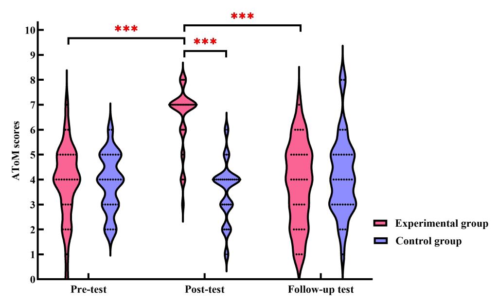图1 实验组和对照组的前测、后测和后续测试的高级心理理论(AToM)得分