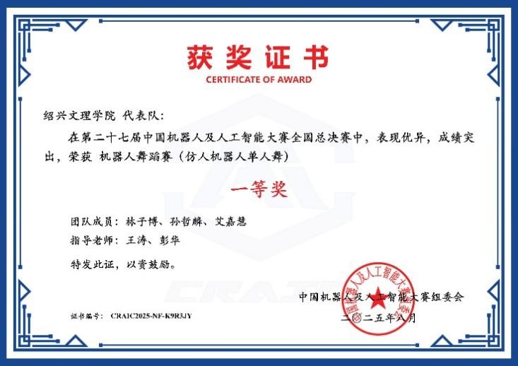 近日,由中国人工智能学会主办的第二十七届中国机器人及人工智能大赛全国总决赛落下帷幕。经过十天的激烈角逐,由我校智能工程学院组织,彭华、李菁、屠昂燕、王涛、陈建卫等老师指导,来自智能工程学院、蔡元培艺术与设计学院、商学院的学生组成的参赛队伍,在仿人机器人单人舞、多人舞两个赛项中取得了优异成绩:共获得全国一等奖4项、二等奖1项、三等奖1项。尤其是仿人机器人单人舞赛项,我校学子再次夺得全国第一名!这是继2022年、2023年后,我校学子第三次捧起冠军奖杯!!
